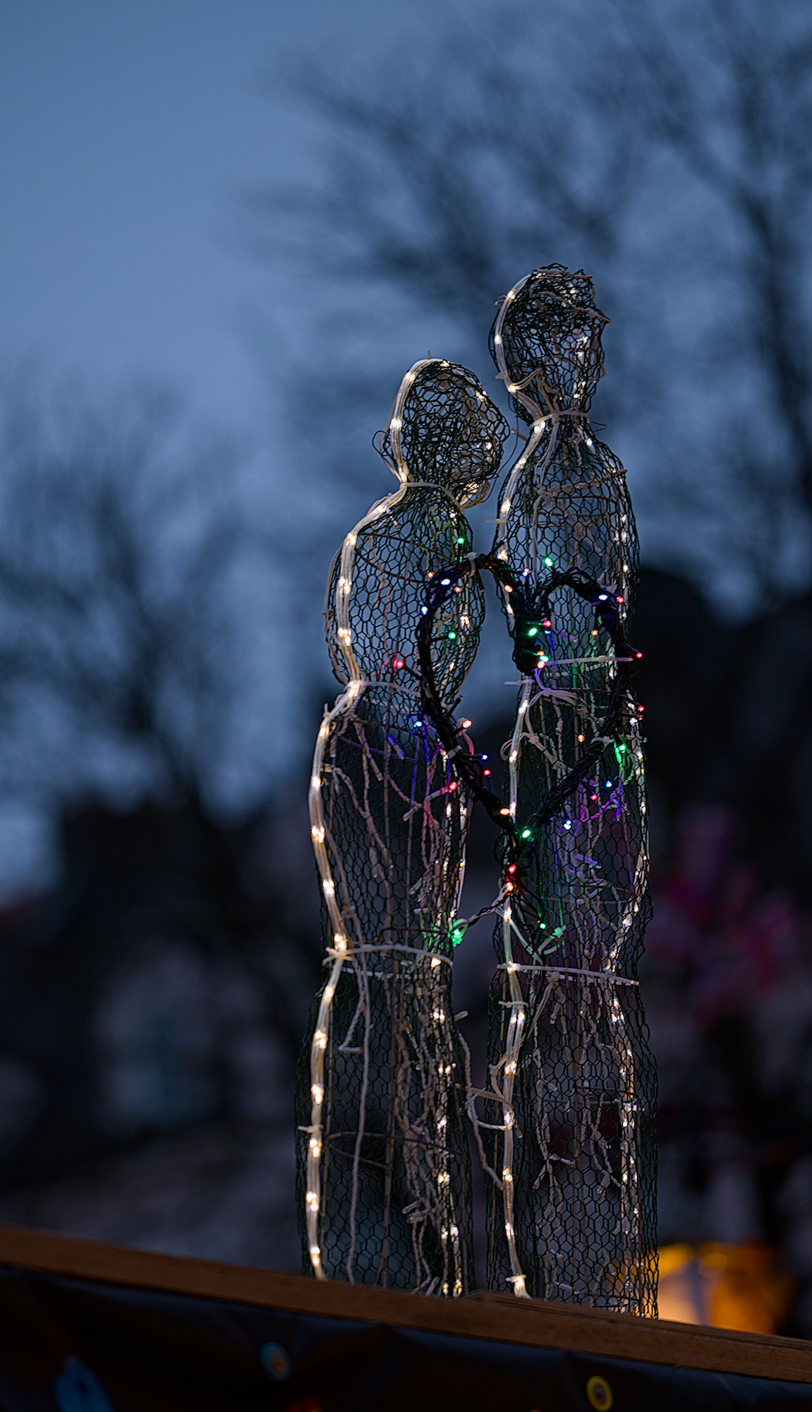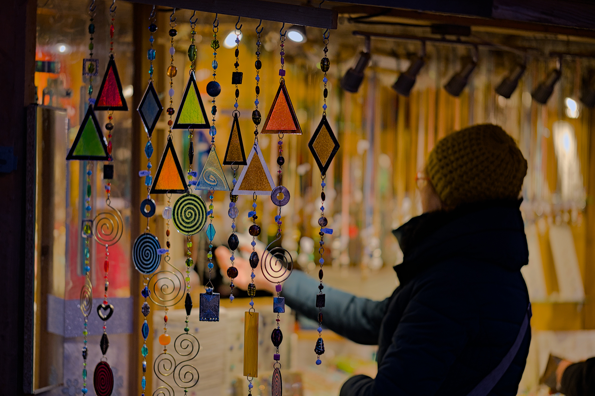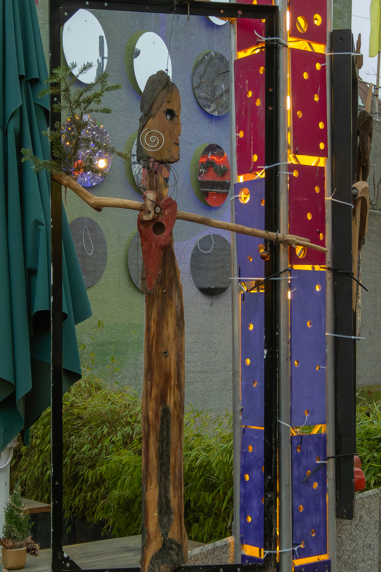 Es stellte sich heraus, dass dieser Markt etwas ganz Besonderes war. Er war mehr ein Kunstmarkt. Zahlreiche Kunsthandwerker boten dort ihre Arbeiten aus Glas, Keramik oder Leder an. Auch Bilder konnte man kaufen. Viele Lichtinstallationen sorgten für eine stimmungsvolle Atmosphäre. Und natürlich gab es auch Glühwein und Essensstände. Wir verteilten uns und machten Fotos. Es galt, die vielen reizvollen Motive im Licht der künstlichen Beleuchtung und der letzten Reste des Tageslichts einzufangen.